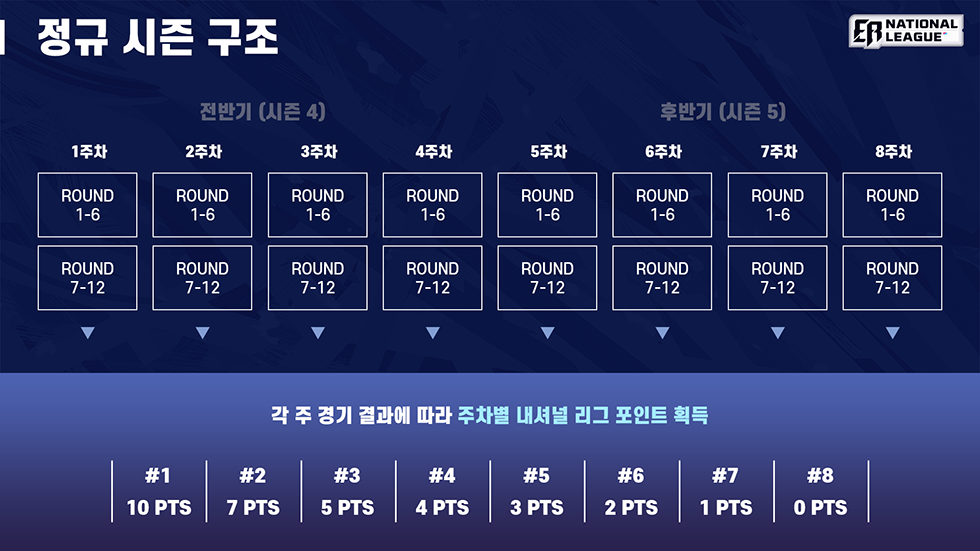 각 팀은 정규 시즌 동안 각 주마다 2일 동안 12라운드의 경기를 펼치게 되며, 12라운드의 합계 점수에 따라 주차별 순위가 정해지게 된다. 각 팀은 주차별 순위에 따라 ‘내셔널 리그 포인트’를 받게되며 8주간의 ‘내셔널 리그 포인트’ 합계로 정규 시즌의 순위를 정하게 된다.